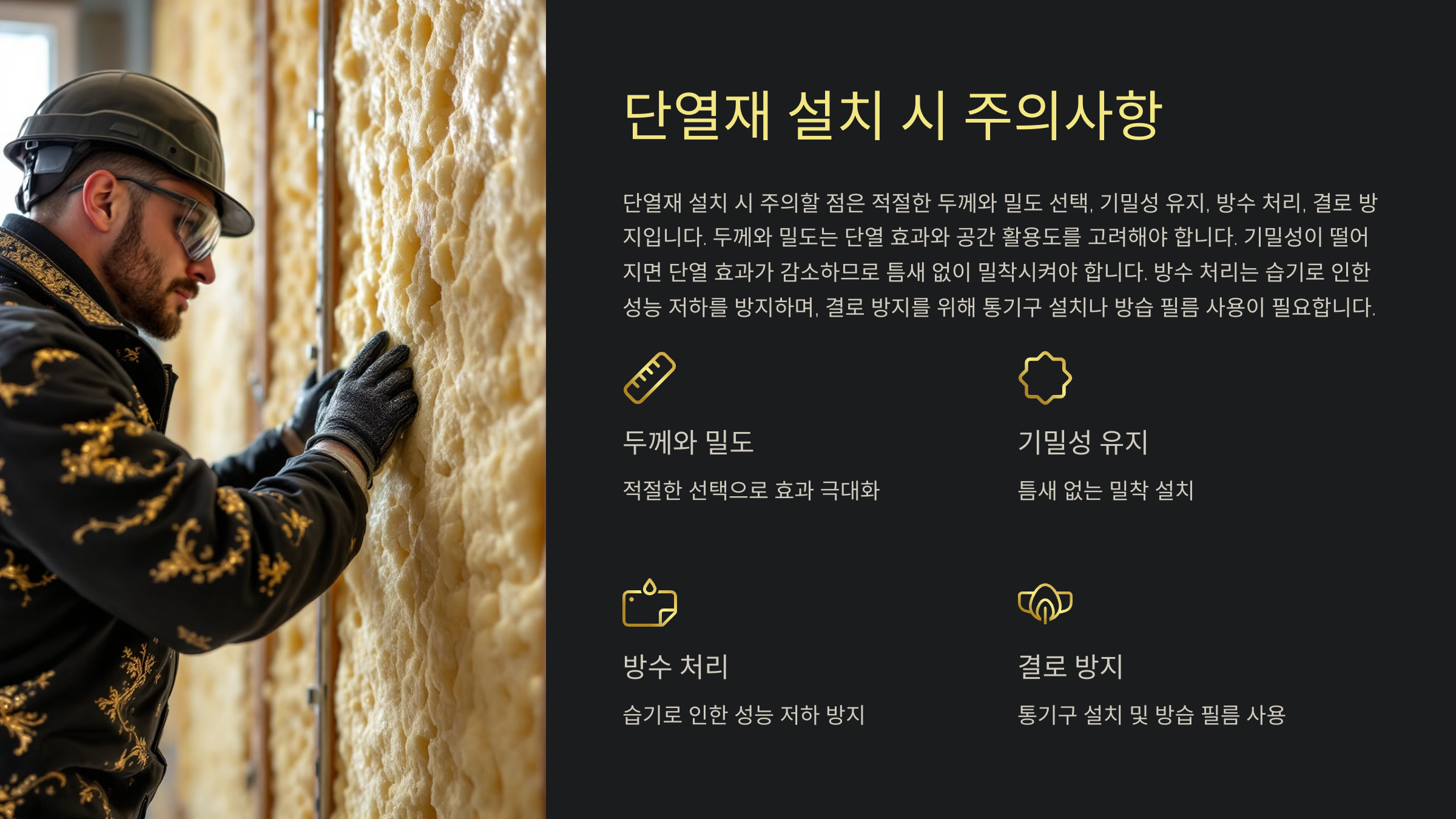 단열재 설치 시 방습 필름을 추가하고 통기구를 설치하여 결로를 방지할 수 있습니다. 결로는 단열재와 벽체 사이의 공기 순환을 통해 최소화할 수 있습니다.
