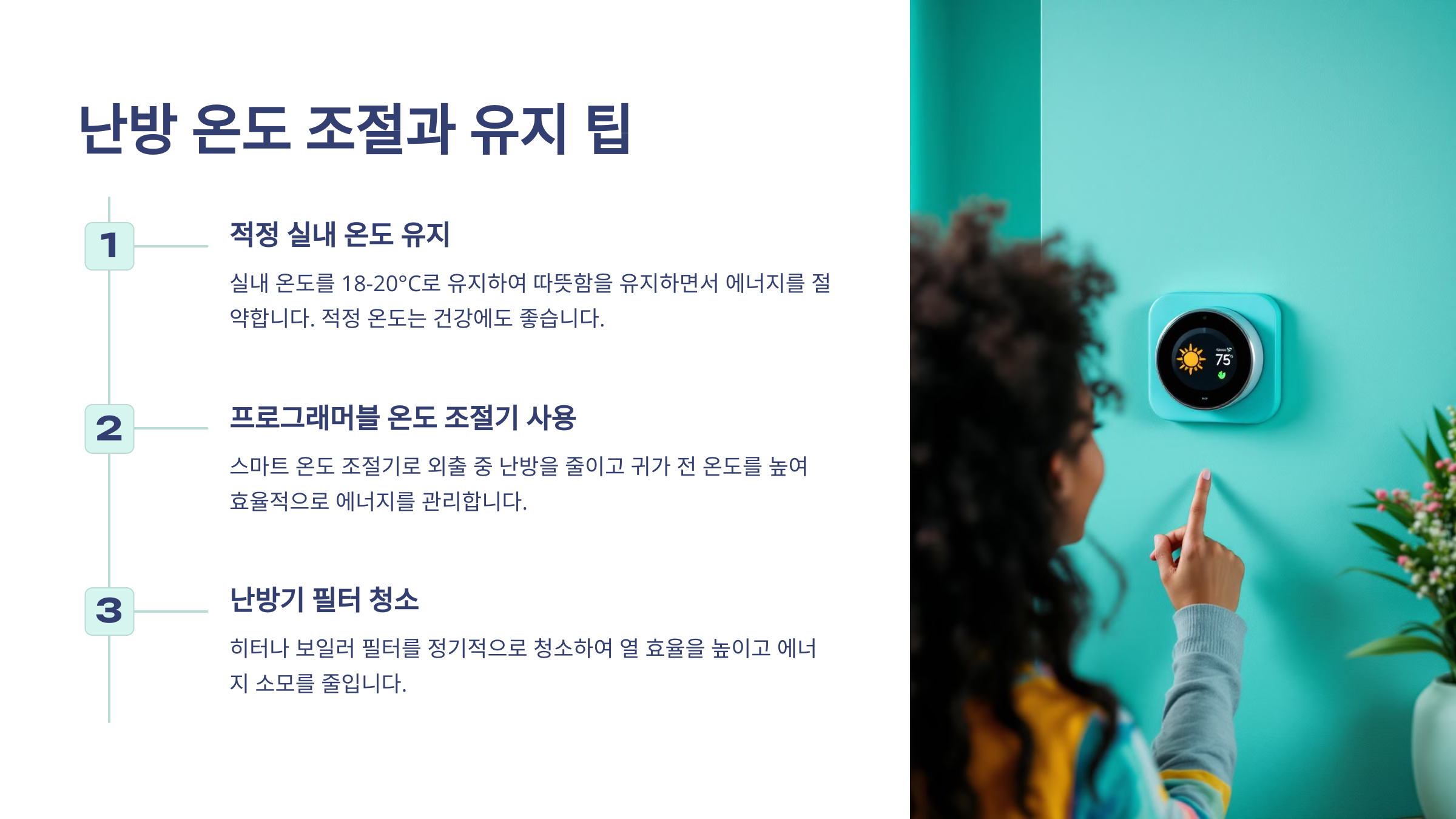 - 적정 실내 온도 유지: 실내 온도를 18-20°C 정도로 유지하면 따뜻함을 유지하면서도 에너지를 절약할 수 있습니다. 실내 온도가 너무 높으면 불필요한 에너지 소모로 난방비가 급격히 증가합니다. 적정 온도 유지는 건강에도 좋습니다.