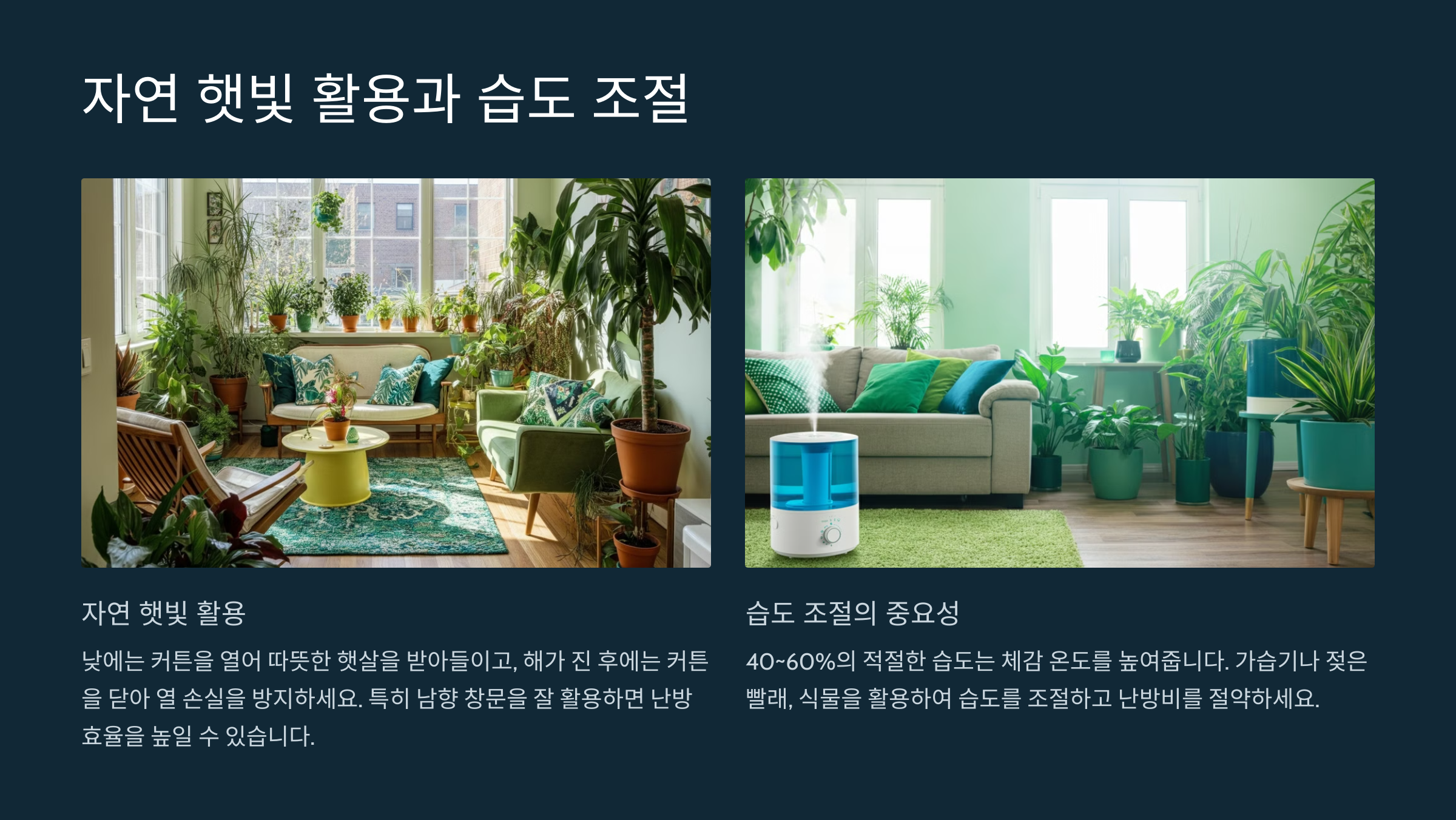 실내 습도를 약 40~60%로 유지하면 체감 온도가 올라가 난방을 덜 하더라도 따뜻함을 느낄 수 있습니다. 가습기를 사용하거나 젖은 빨래를 실내에 널어놓으면 습도 조절에 도움이 됩니다. 습도가 적절하게 유지되면 공기가 덜 건조해져서 체온 유지에 더 효율적이므로, 난방 기기의 사용 빈도를 줄일 수 있습니다. 또한, 식물은 실내 습도를 자연스럽게 조절해 주는 역할을 하므로, 공기 정화 효과와 함께 이중의 이점을 제공합니다.
