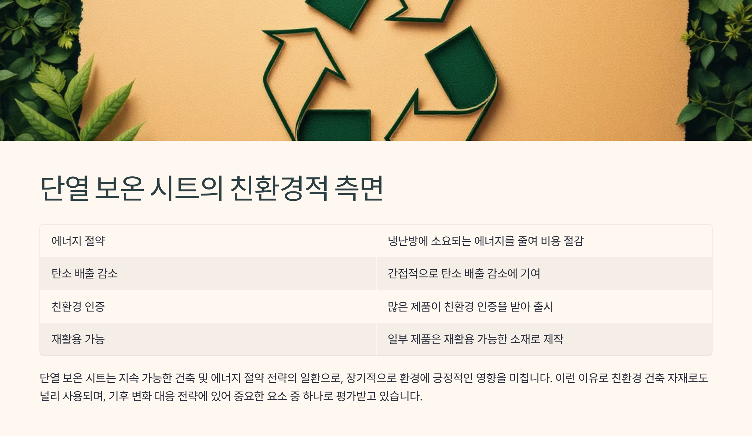 단열 보온 시트는 에너지 소비를 줄임으로써 간접적으로 탄소 배출 감소에 기여합니다. 이는 지속 가능한 건축 및 에너지 절약 전략의 일환으로 볼 수 있습니다. 오늘날 많은 제품은 친환경 인증을 받아 출시되며, 일부는 재활용 가능한 소재로 만들어져 환경 보호에 기여하고 있습니다.