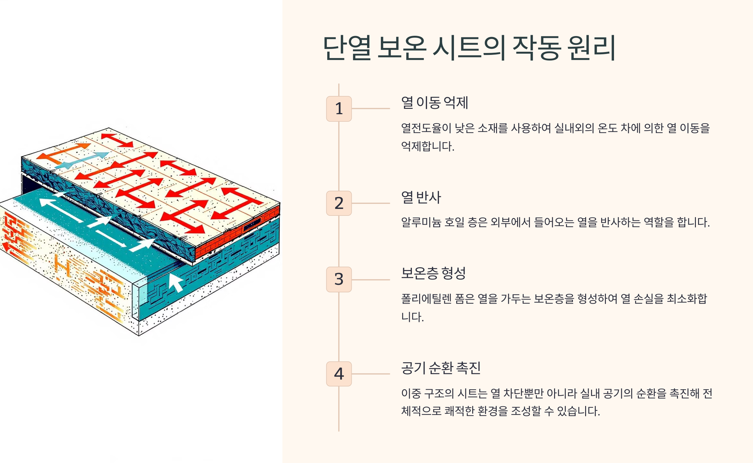 단열 보온 시트의 작동 원리는 열전도율이 낮은 소재를 사용하여 실내외의 온도 차에 의한 열 이동을 억제하는 데 있습니다. 구체적으로, 내부의 따뜻한 공기가 벽이나 창을 통해 외부로 빠져나가는 것을 방지하고, 외부의 차가운 공기가 실내로 유입되는 것을 막아 실내 온도를 안정적으로 유지해 줍니다.