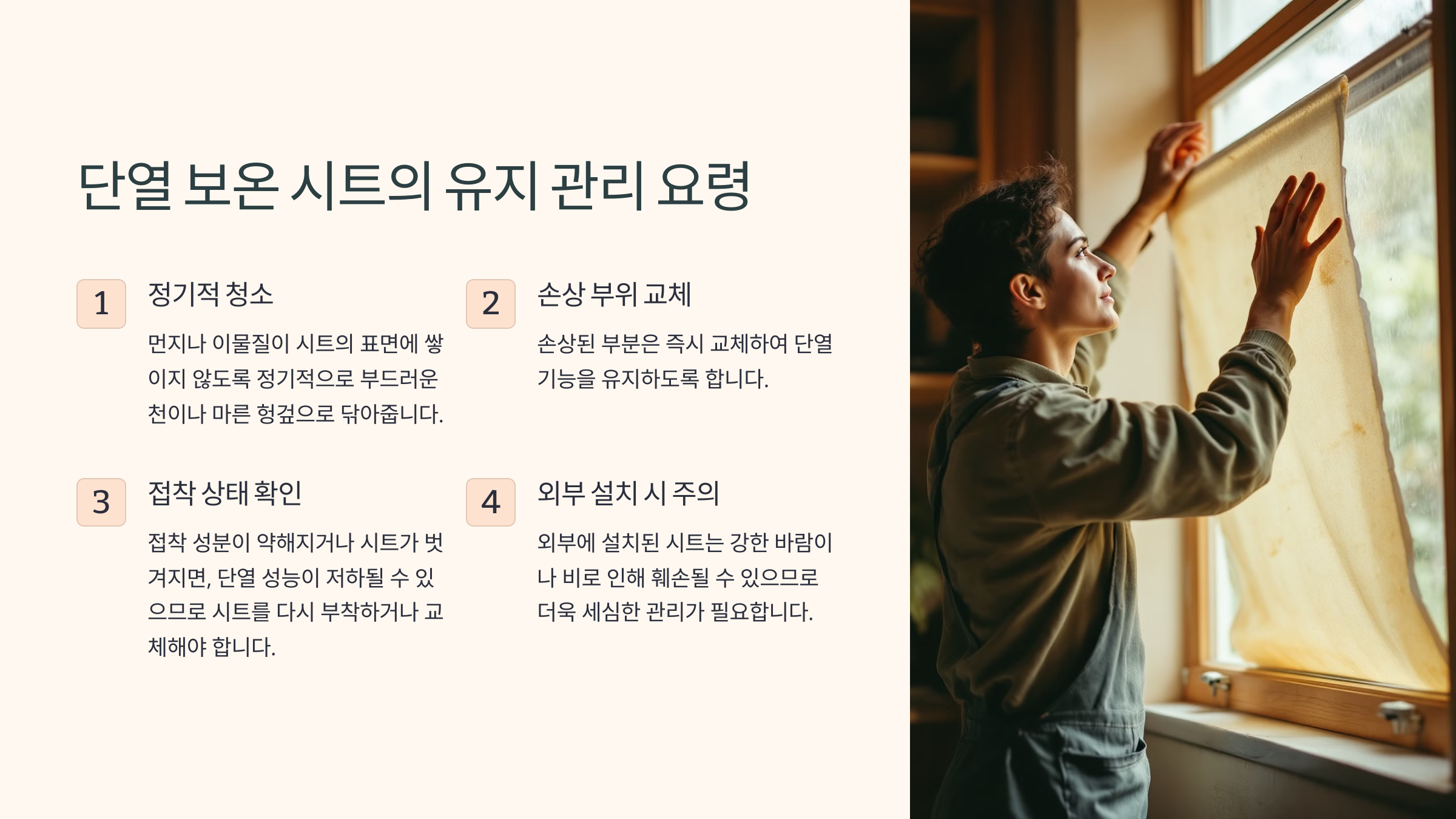 손상된 부분은 즉시 교체하여 단열 기능을 유지하도록 합니다. 접착 성분이 약해지거나 시트가 벗겨지면, 단열 성능이 저하될 수 있으므로 시트를 다시 부착하거나 교체해야 합니다. 특히 외부에 설치된 시트는 강한 바람이나 비로 인해 훼손될 수 있으므로 더욱 세심한 관리가 필요합니다.