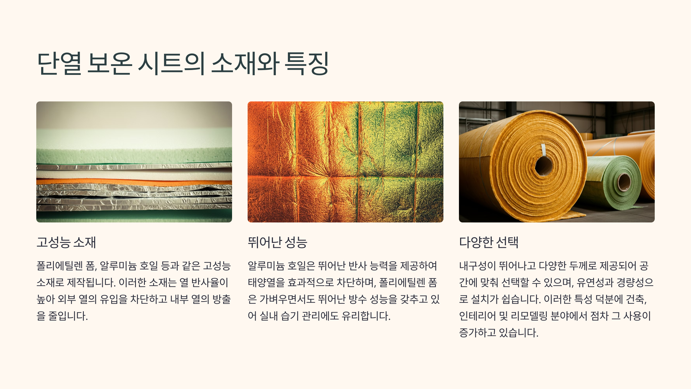 단열 보온 시트는 폴리에틸렌 폼, 알루미늄 호일 등과 같은 고성능 소재로 제작됩니다. 이러한 소재는 열 반사율이 높아 외부 열의 유입을 차단하고 내부 열의 방출을 줄입니다. 특히 알루미늄 호일은 뛰어난 반사 능력을 제공하여 태양열을 효과적으로 차단하며, 폴리에틸렌 폼은 가벼우면서도 뛰어난 방수 성능을 갖추고 있어 실내 습기 관리에도 유리합니다.
