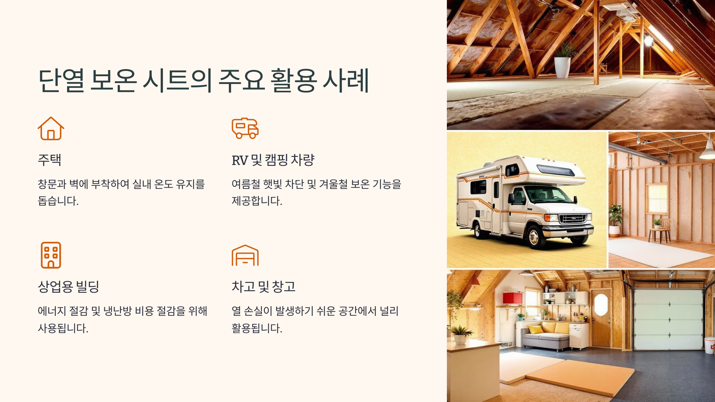 단열 보온 시트는 다양한 장소에서 효율적으로 사용됩니다. 대표적으로, 주택의 창문과 벽에 부착하여 실내 온도 유지를 도울 수 있습니다. 이외에도 RV, 캠핑 차량, 상업용 빌딩, 차고, 창고 등 열 손실이 발생하기 쉬운 공간에서 널리 활용됩니다.