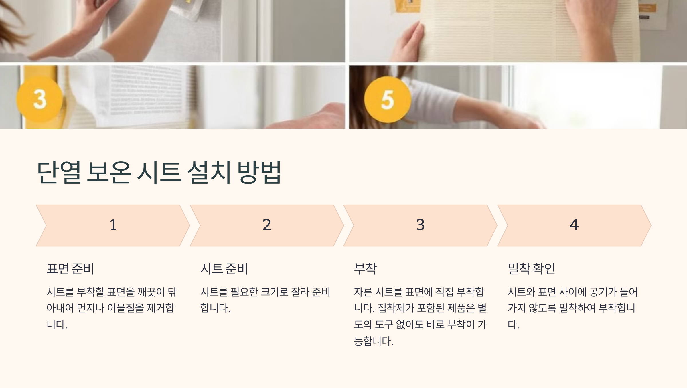 설치 시 주의할 점은 시트와 표면 사이에 공기가 들어가지 않도록 밀착하여 부착하는 것입니다. 이렇게 하면 단열 성능이 극대화되고 시트의 내구성도 오래 유지됩니다. 또한 창문에 부착할 경우, 겨울철에는 창문에 밀착하여 부착하고 여름철에는 열이 반사되도록 외부를 향해 부착하는 것이 효과적입니다.