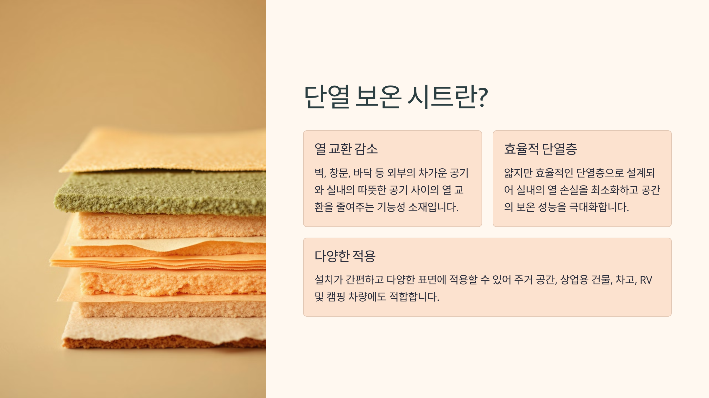 단열 보온 시트는 설치가 간편하고 다양한 표면에 적용할 수 있어 주거 공간뿐만 아니라 상업용 건물, 차고, RV 및 캠핑 차량에도 적합합니다. 이러한 범용성은 단열 보온 시트가 지속적으로 인기를 끄는 이유 중 하나입니다.