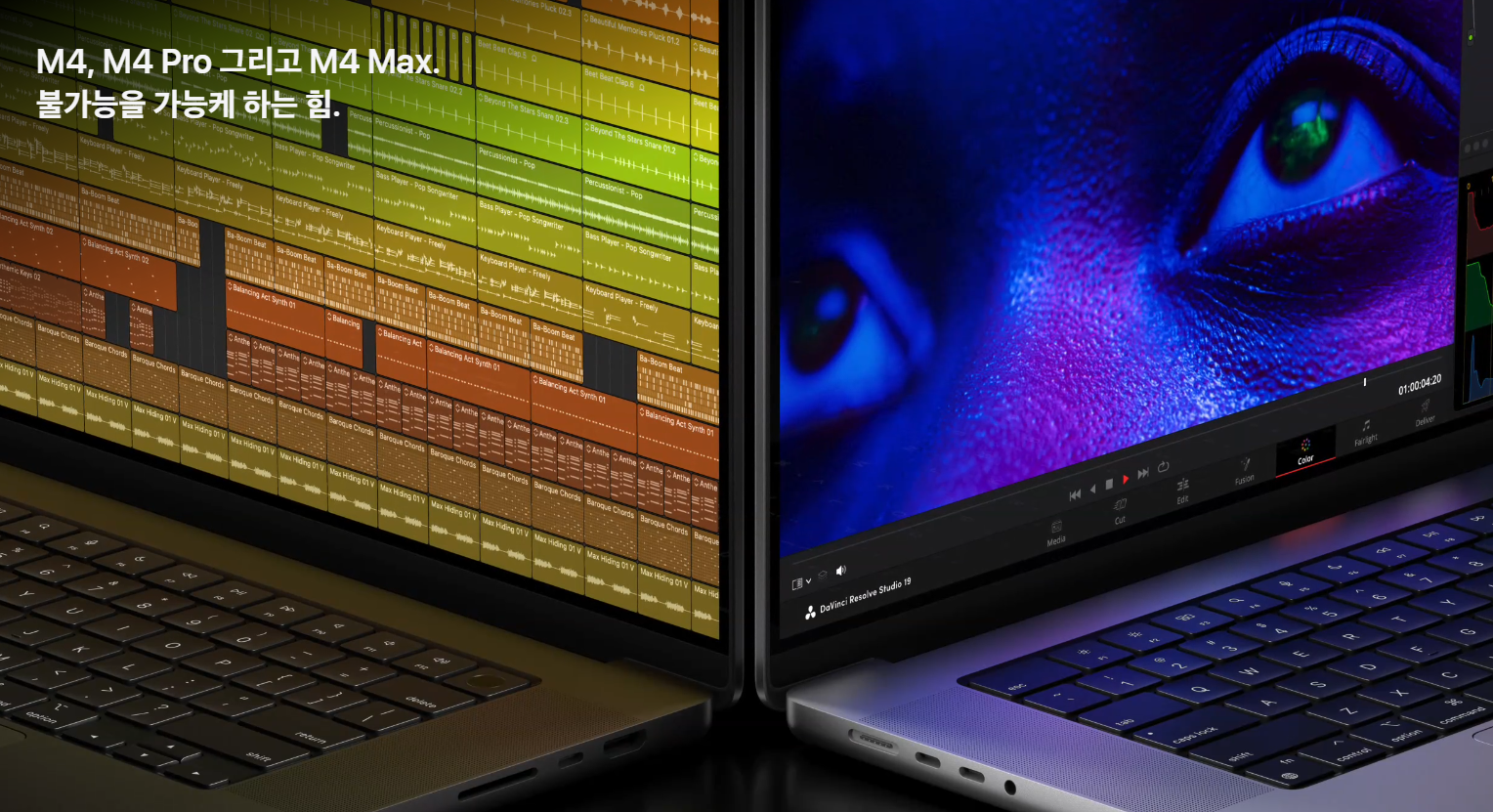 애플의 새로운 M4 칩은 8코어 CPU와 16코어 GPU를 갖추고 있어 이전 모델 대비 더 빠르고 효율적인 성능을 제공합니다. M4 Pro Max는 10코어 CPU와 24코어 GPU로 한 단계 더 강력한 성능을 자랑하며, 고사양 작업이나 전문적인 창작 환경에서도 문제없이 작동합니다.