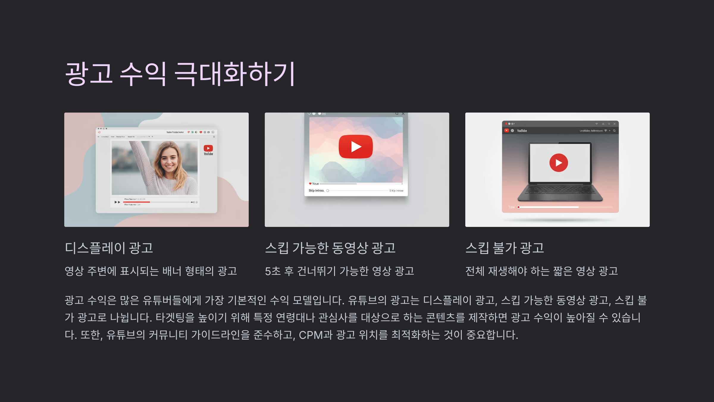 광고 수익은 대부분의 유튜버들이 가장 먼저 활용하는 수익화 모델로, 유튜브의 광고는 크게 디스플레이 광고, 스킵 가능한 광고, 스킵 불가 광고로 구분됩니다. 이러한 광고의 위치와 유형에 따라 수익에 차이가 발생합니다.
