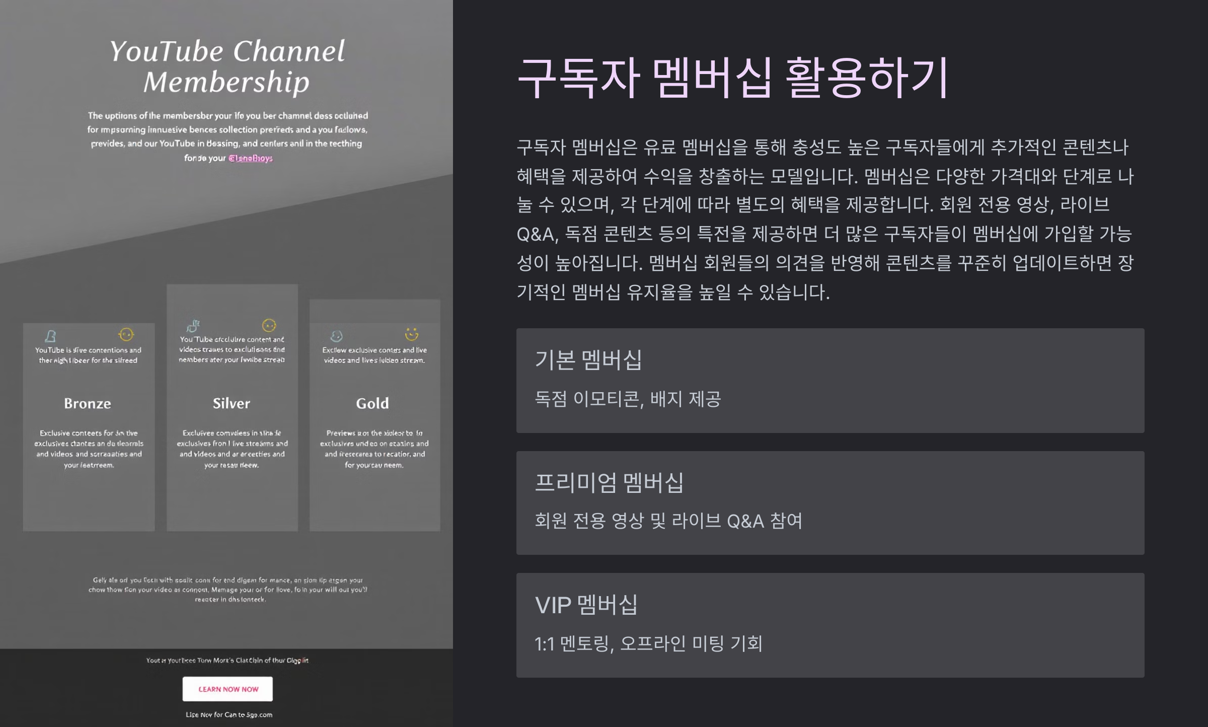 - 멤버십 전용 콘텐츠 제공: 회원만을 위한 특별 영상이나 라이브 Q&A, 배경 지식 콘텐츠 등을 통해 차별화된 가치를 제공합니다.
