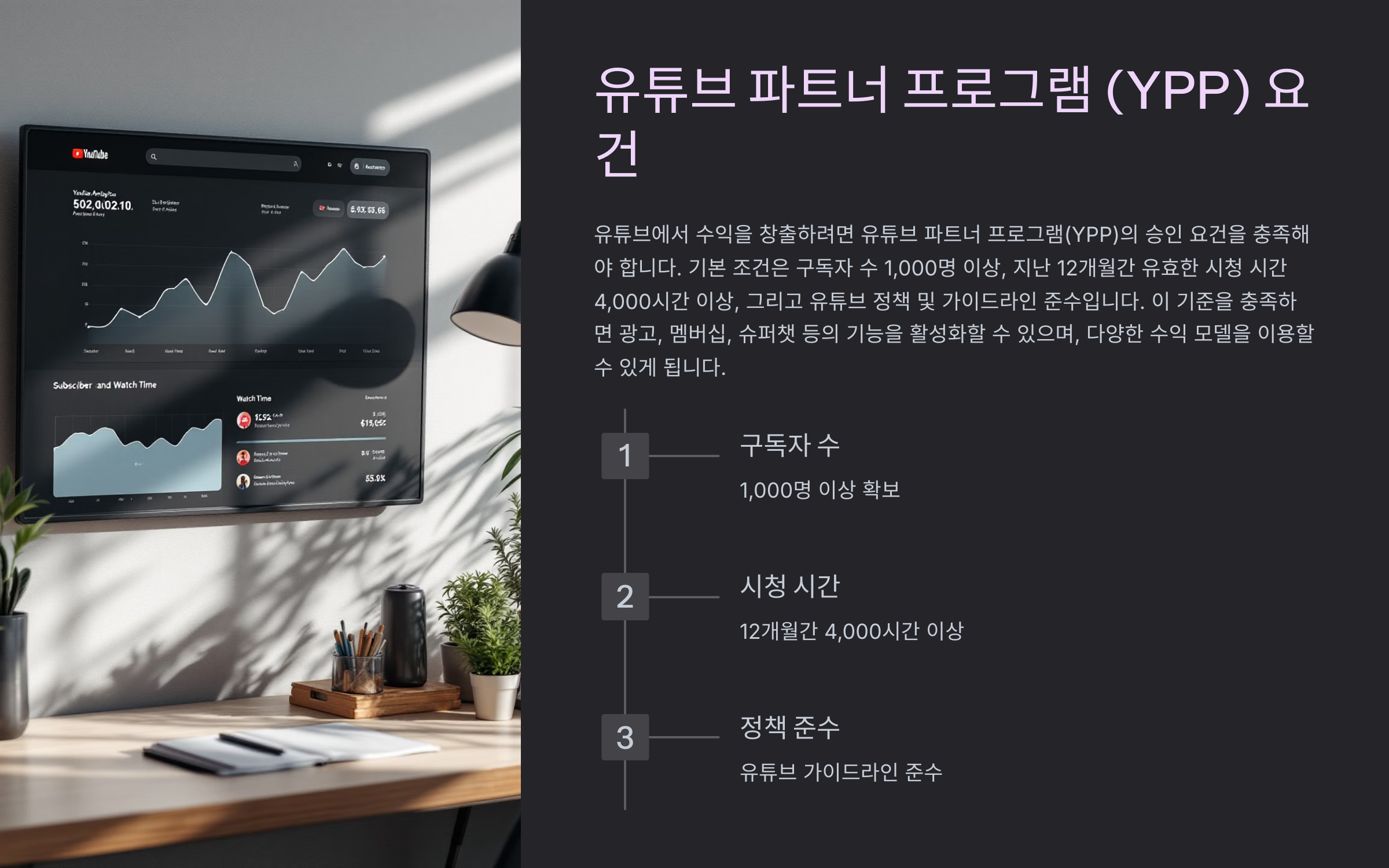 유튜브에서 수익을 창출하려면 우선 유튜브 파트너 프로그램(YouTube Partner Program, YPP)의 승인을 받아야 합니다. 이 승인에는 몇 가지 기본 요건이 필요하며, 주된 조건은 다음과 같습니다:
