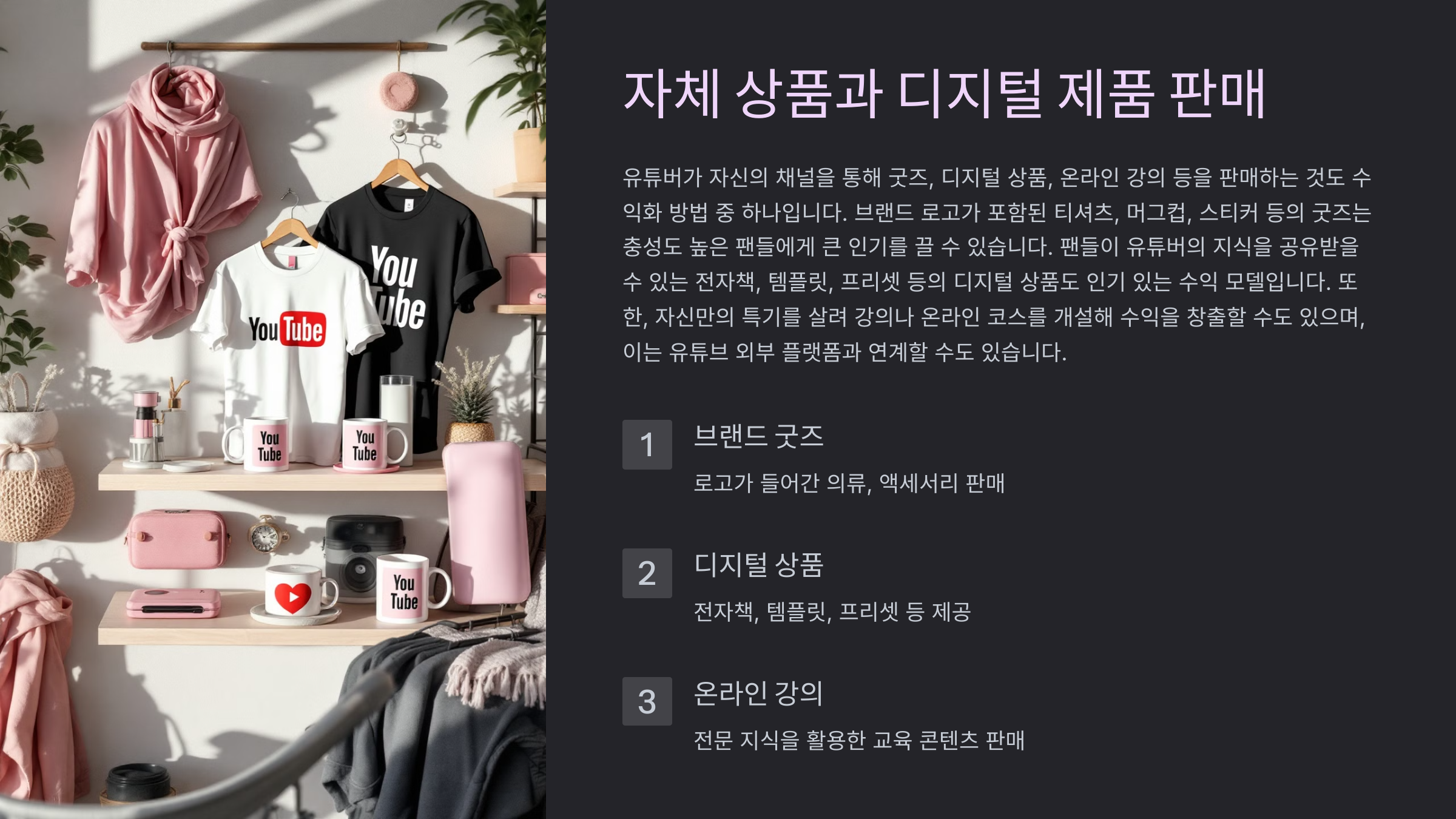 자신의 브랜드를 활용해 굿즈를 판매하거나 지식과 노하우를 공유하는 디지털 상품 및 온라인 강의는 유튜브 수익화 모델 중 하나입니다.